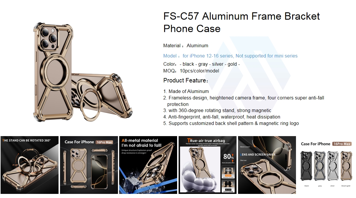 The C57 Aluminum Frame Bracket Phone Case is a premium, all-metal protective solution designed for iPhone 12–16 Pro Max (excluding mini models). Crafted from a single piece of aircraft-grade aluminum, it features a bold frameless design that showcases your phone’s original aesthetics while delivering military-grade anti-fall protection. Its standout feature is the integrated aluminum frame bracket structure, which reinforces all four corners for extreme drop resistance, paired with a 360-degree rotating metal stand that doubles as a magnetic mount for MagSafe charging. The case also includes a heightened aluminum camera frame, anti-fingerprint coating, and waterproof, heat-dissipating design, making it ideal for tech enthusiasts and outdoor users who demand both style and uncompromising durability. As a direct manufacturer, we offer custom back shell patterns and magnetic ring logos, backed by ample stock for fast dispatch.