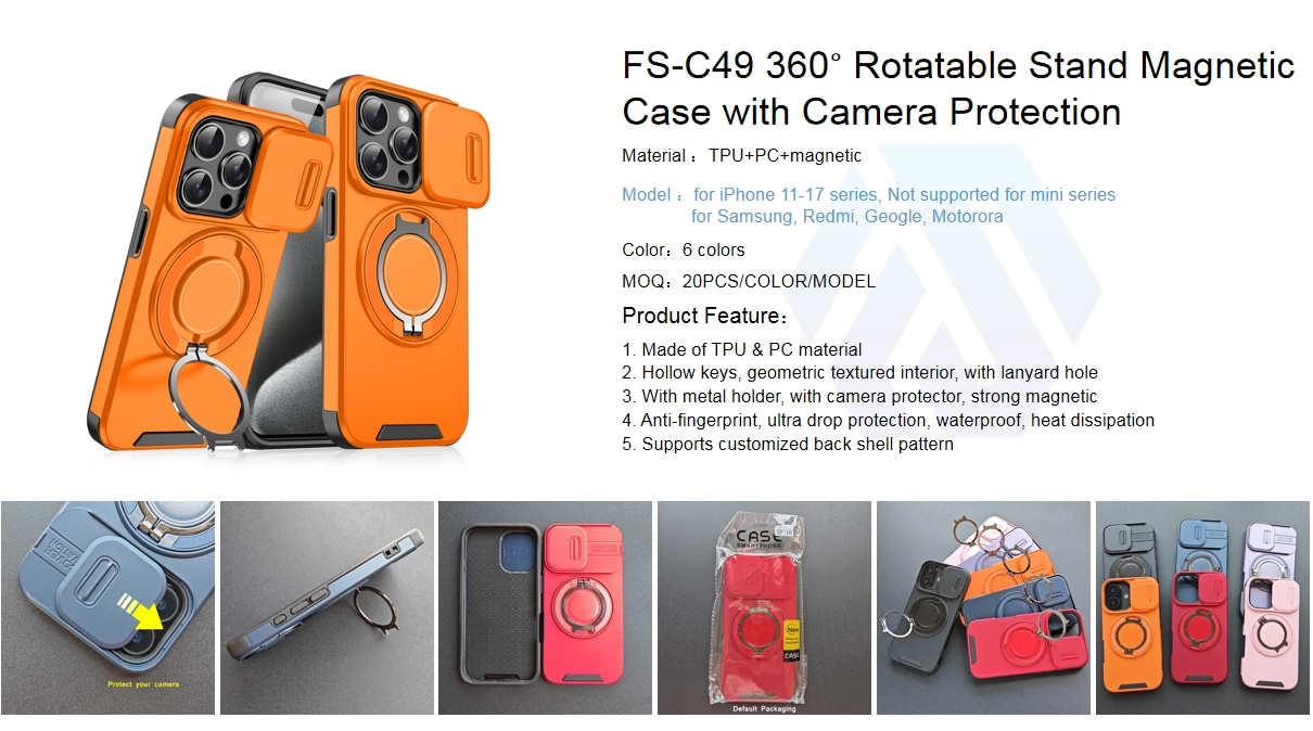 The C49 360 degree Rotatable Stand Magnetic Case is engineered for users who demand rugged protection and versatile functionality across multiple device brands. Crafted from a dual-layer of shock-absorbent TPU and rigid PC, it delivers ultra drop protection, while the integrated camera protector shields your lens from scratches and impacts. Its standout feature is the 360 degree rotatable metal stand, which doubles as a secure magnetic mount and hands-free viewing support for any angle. The case also features hollow responsive keys, a lanyard hole, geometric textured interior for grip, and an anti-fingerprint, waterproof, and heat-dissipating design, making it ideal for daily use and outdoor activities. As a direct manufacturer, we offer custom back shell patterns, backed by ample stock for fast dispatch.