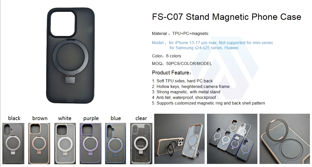 The C07 Stand Magnetic Phone Case combines robust protection, versatile functionality, and modern style for flagship devices from iPhone, Samsung, and Huawei. Crafted from a shock-absorbent TPU frame and a rigid PC back, it delivers defense against drops, scratches, and daily wear, while the built-in high-strength magnetic ring ensures seamless MagSafe charging and accessory compatibility. Its standout feature is the integrated metal kickstand, which doubles as a secure magnetic mount and a hands-free stand for horizontal/vertical viewing. The case also features hollow responsive keys, a heightened camera frame, and an anti-fall, waterproof, and shockproof design, making it ideal for both daily use and outdoor activities. As a direct manufacturer, we offer custom magnetic ring colors and back shell patterns, backed by ample stock for fast dispatch.