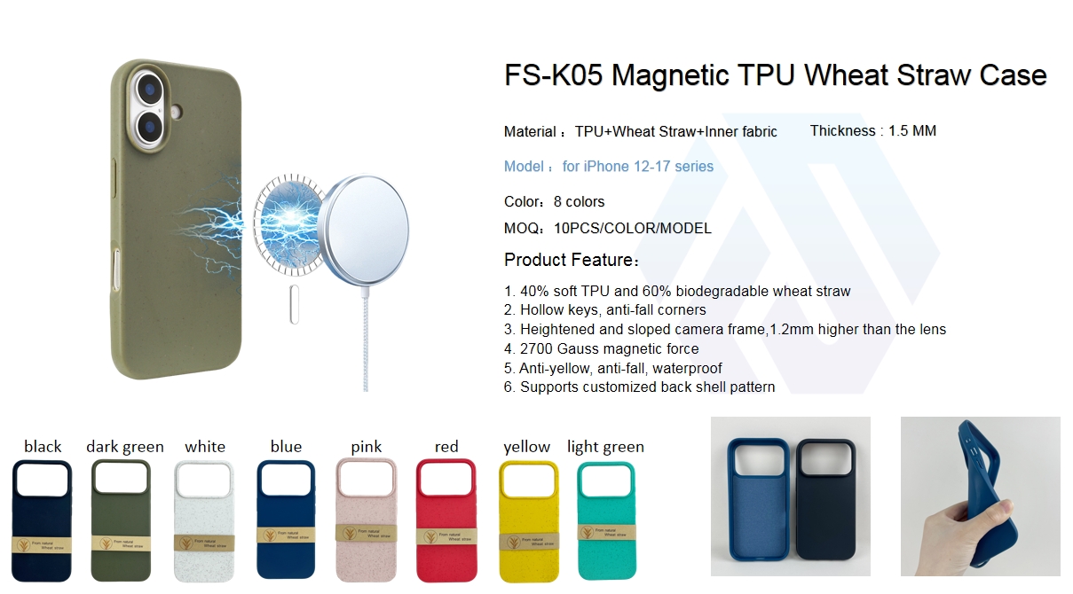The K05 Magnetic TPU Wheat Straw Case is an eco-friendly and functional protective solution designed for iPhone 12–17 series. Constructed from 40% soft TPU + 60% biodegradable wheat straw with an inner fabric lining, it balances sustainability with reliable defense, while a built-in 2700 Gauss magnetic ring ensures seamless MagSafe charging alignment. The case features hollow keys, anti-fall corners, and a heightened sloped camera frame (1.2mm higher than the lens) for enhanced usability and protection. With 1.5mm thickness, it offers anti-yellow, anti-fall, and waterproof performance, and supports customization of back shell patterns, making it ideal for eco-conscious users who value both sustainability and magnetic charging convenience.