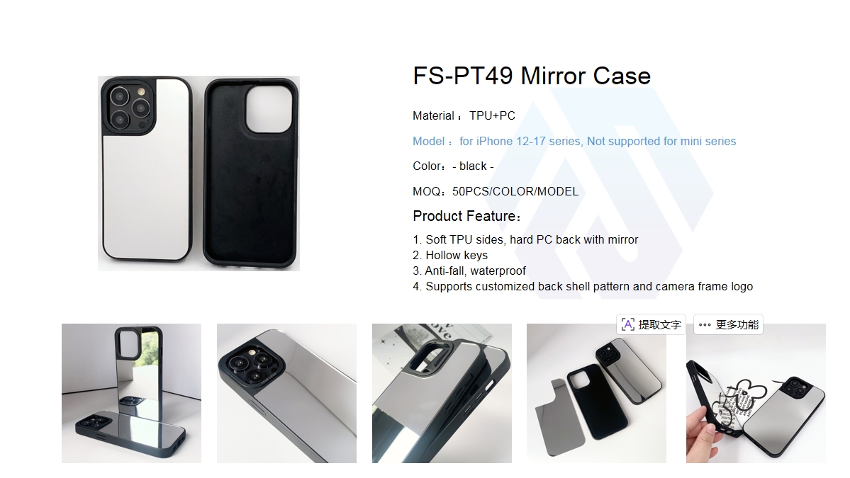 The PT49 Mirror Case is a sleek, functional protective solution designed for iPhone 12–17 series (excluding mini models). It features a hybrid TPU+PC construction with soft, shock-absorbent TPU sides and a hard PC back integrated with a mirror surface, combining practical protection with a convenient on-the-go mirror. The hollow key design ensures responsive button feedback, while the case offers anti-fall and waterproof performance to safeguard your device in daily use. It supports customization of back shell patterns and camera frame logos, making it suitable for both personal use and branding applications.