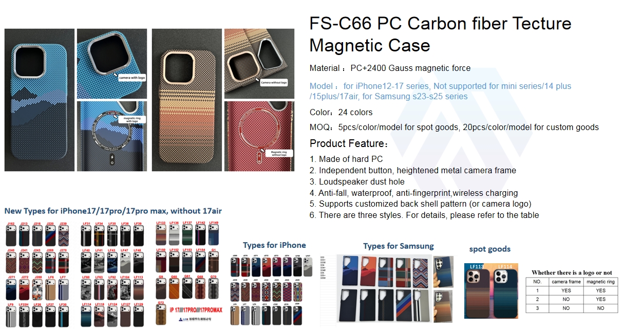 The C66 PC Carbon Fiber Texture Magnetic Case is designed for users who want a rugged, premium aesthetic paired with a comfortable, tactile feel. Crafted from high-hardness PC material with a carbon fiber texture, it delivers slim yet robust protection against drops, scratches, and daily wear, while its smooth, skin-friendly surface feels great in your hand. Its standout feature is the 2400 Gauss high-strength magnetic ring, which ensures seamless MagSafe wireless charging and accessory compatibility, while the independent responsive buttons and heightened metal camera frame enhance usability and lens protection. With 24 vibrant color options and 3 distinct texture styles, this case balances style and functionality perfectly. As a direct manufacturer, we offer custom back shell patterns and camera frame logos, backed by ample stock for fast dispatch.