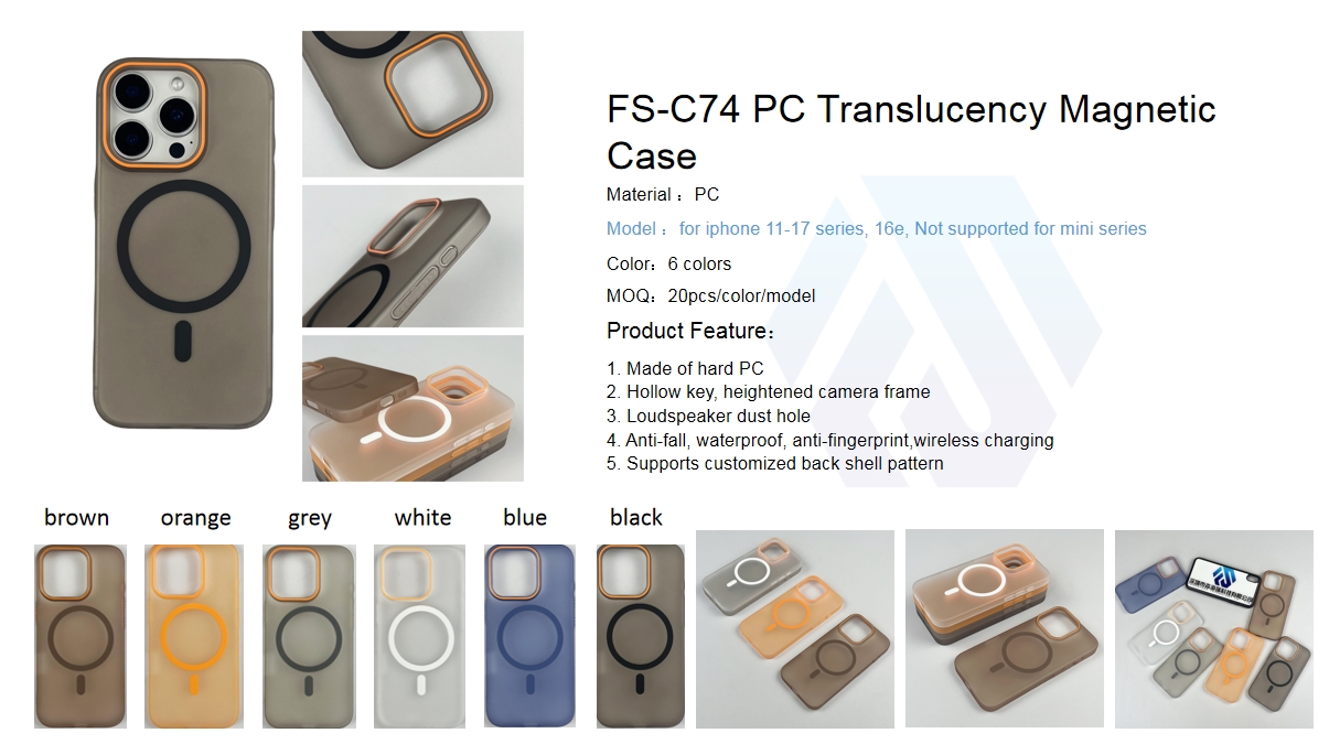 The C74 PC Translucency Magnetic Case is designed for users who value long-lasting clarity, a premium tactile feel, and slim protection. Crafted from high-hardness PC material, it features anti-yellowing properties that keep the translucent finish crystal-clear over time, while the ultra-slim profile adds minimal bulk to your device. The surface is sprayed with skin-feel oil, delivering a soft, non-slip grip that feels incredibly comfortable in your hand and repels fingerprints for a clean, low-maintenance look. Its built-in high-strength magnetic ring ensures seamless MagSafe wireless charging, and the case also includes hollow responsive keys, a heightened camera frame, and waterproof design for all-around reliability. As a direct manufacturer, we offer custom back shell patterns, backed by ample stock for fast dispatch.
