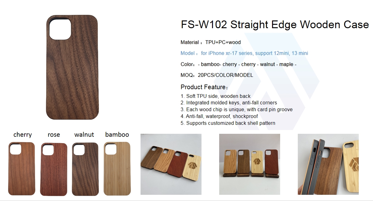 The W102 Straight Edge Wooden Case is a natural and durable protective solution designed for iPhone XR–17 series (including 12mini, 13mini models). Its defining feature is the straight edge flush frame design—the wooden back panel sits perfectly flush with the TPU+PC frame, so no case bezel is visible from the front, creating a seamless, sleek appearance. Constructed from TPU+PC+natural wood, it combines flexible TPU sides for shock absorption, a rigid PC structure for stability, and a unique natural wood back where each wood chip has a one-of-a-kind grain pattern. The integrated molded keys, anti-fall corners, and card pin groove add practicality, while the case offers anti-fall, waterproof, and shockproof performance.