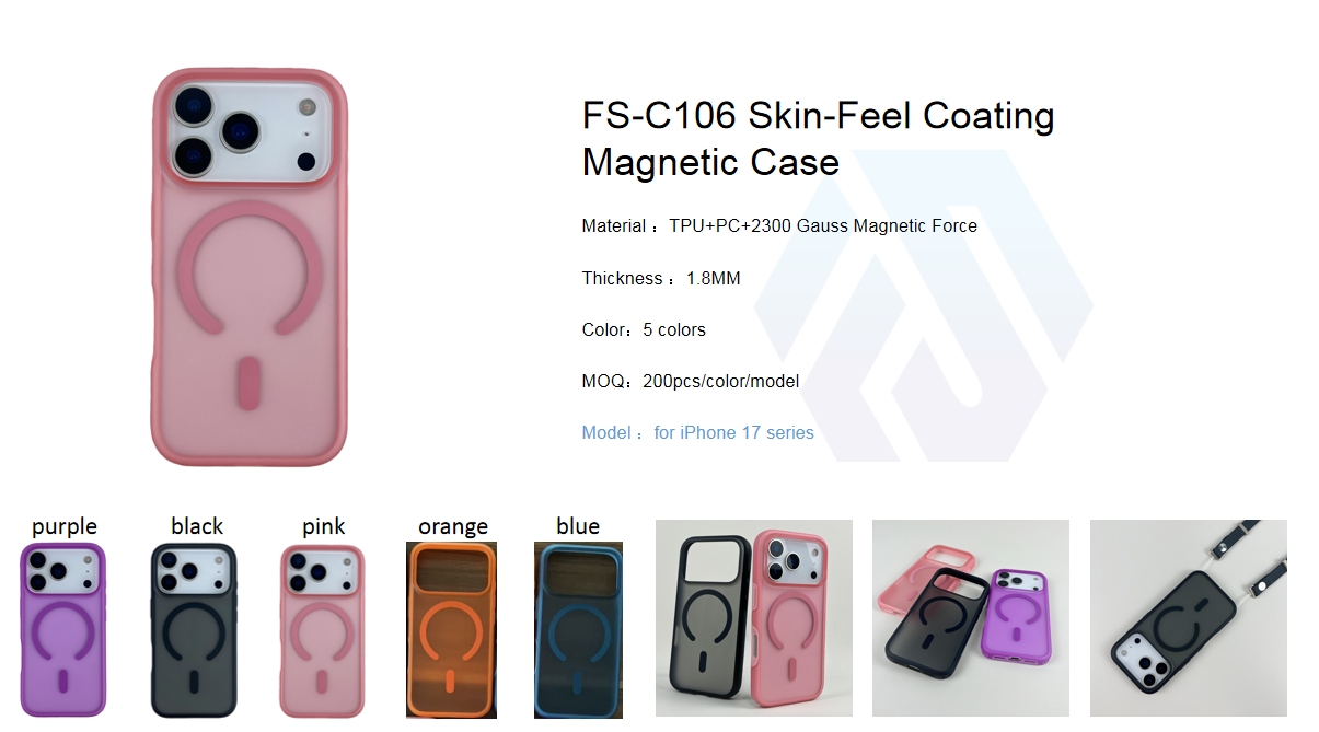 The C106 Skin-Feel Coating Magnetic Case is designed exclusively for the iPhone 17 series, prioritizing a premium tactile experience and everyday practicality. It features a 1.8MM slim TPU+PC construction with a skin-feel frosted coating that delivers a soft, non-slip grip and repels fingerprints for a clean, low-maintenance look. The built-in 2300 Gauss high-strength magnetic ring ensures seamless MagSafe wireless charging, while the integrated lanyard hole at the bottom lets you attach a strap for secure, hands-free carrying. With 5 muted, versatile colors, it balances comfortable grip, reliable protection, and convenient functionality perfectly.