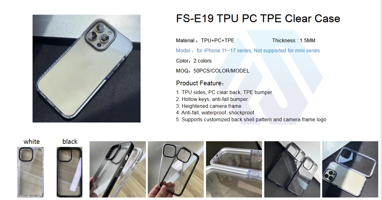 The E19 TPU PC TPE Clear Case is a slim, durable 3-in-1 protective solution designed for iPhone 11–17 series (excluding mini models). Constructed from TPU+PC+TPE material, it features flexible TPU sides, a scratch-resistant PC clear back, and a shock-absorbent TPE bumper, preserving your phone’s original appearance while delivering reliable defense. The hollow keys and anti-fall bumpers enhance usability and durability, while the heightened camera frame shields the lens from scratches. With 1.5mm thickness, the case offers anti-fall, waterproof, and shockproof performance, and supports customization of back shell patterns and camera frame logos.
