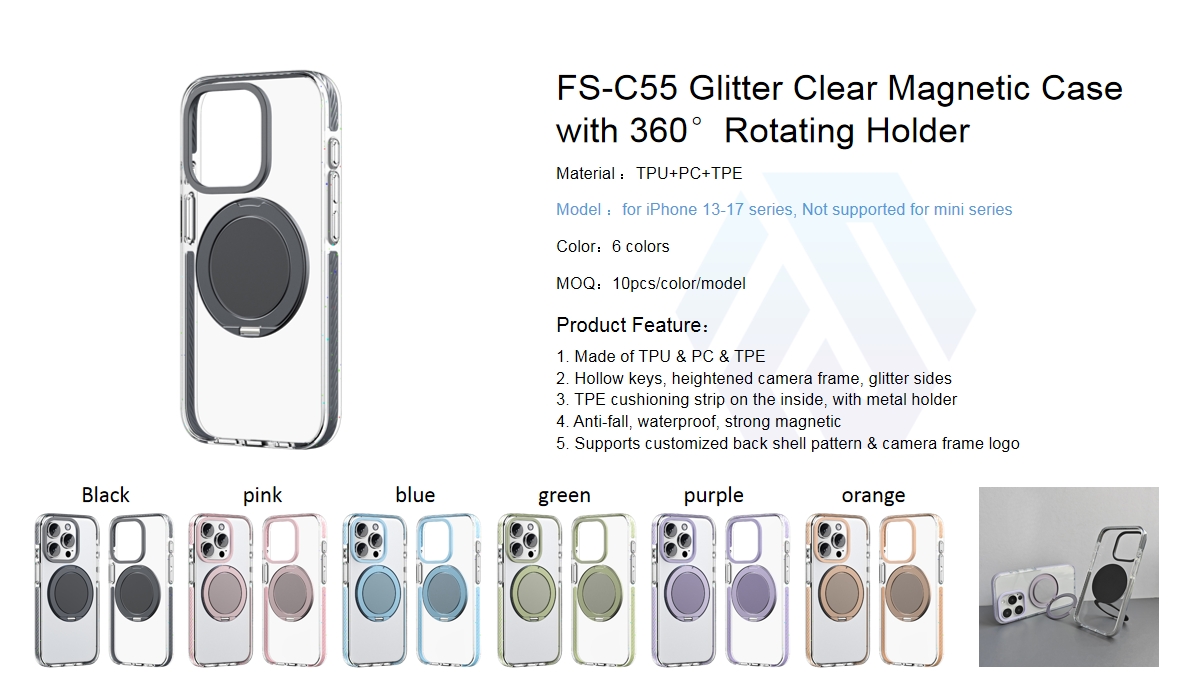 The C55 Glitter Clear Magnetic Case combines playful aesthetics with versatile functionality, designed for iPhone 13–17 Pro Max (excluding mini models). It features a triple-layer construction of TPU, PC, and TPE, delivering slim yet robust defense against drops, scratches, and daily wear. Its standout feature is the side glitter design—sparkly, iridescent infusions on the TPU frame add a subtle, eye-catching sparkle without compromising the transparent PC back that showcases your phone’s original design. The built-in high-strength magnetic ring ensures seamless MagSafe charging, while the 360 degree rotating metal holder provides stable hands-free viewing at any angle. With hollow responsive keys, a heightened camera frame, and an anti-fall, waterproof design, this case balances style and practicality perfectly. As a direct manufacturer, we offer custom back shell patterns and camera frame logos, backed by ample stock for fast dispatch.