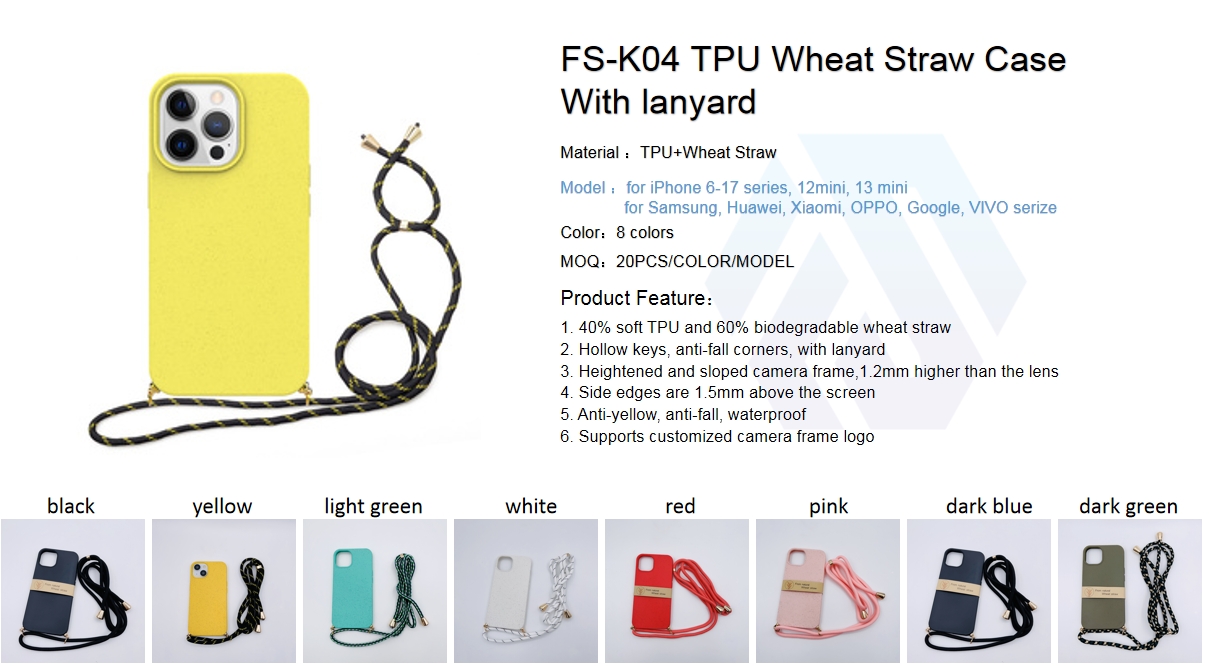 The K04 TPU Wheat Straw Case With Lanyard is an eco-friendly, functional protective solution designed for a wide range of smartphones, including iPhone 6–17 series (including 12mini, 13mini), Samsung, Huawei, Xiaomi, OPPO, Google, and VIVO devices. Constructed from 40% soft TPU + 60% biodegradable wheat straw, it balances sustainability with reliable defense, while the included adjustable nylon lanyard adds convenience for hands-free carrying. The case features hollow keys, anti-fall corners, and a heightened sloped camera frame (1.2mm higher than the lens) for enhanced usability and protection. With 1.5mm raised side edges, it offers anti-yellow, anti-fall, and waterproof performance, and supports customization of camera frame logos, making it ideal for eco-conscious users and on-the-go lifestyles.