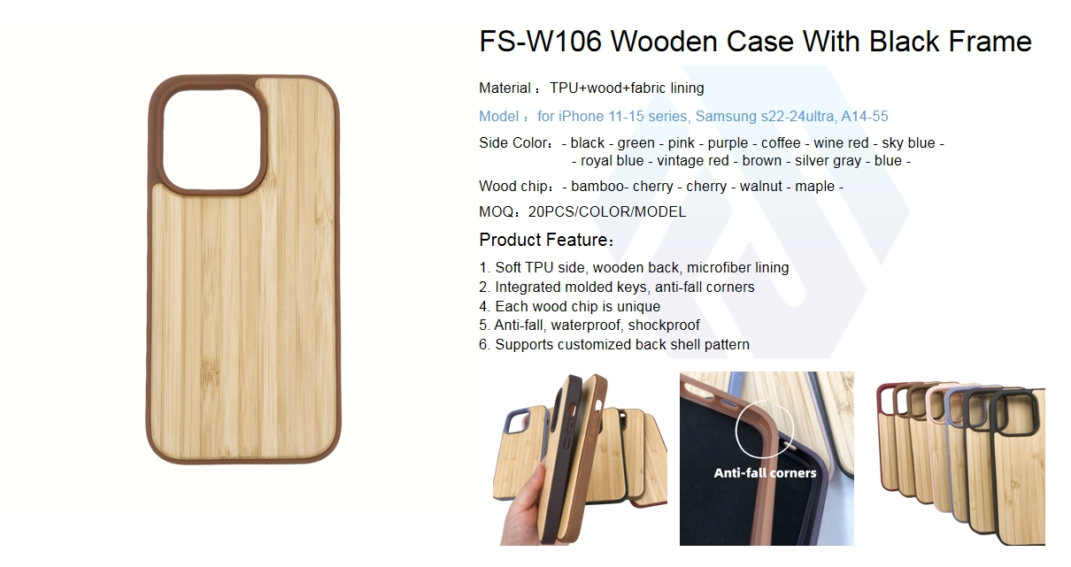 The W106 Wooden Case With Color Frame is a highly customizable protective solution designed for iPhone 11–15 series and Samsung S22–24 Ultra/A14–55 models. Constructed from TPU+natural wood+fabric lining, it features flexible TPU sides (with 12 color options) paired with a natural wood back panel (with 5 wood chip options) and a microfiber fabric inner lining to prevent scratches on your phone. The black frame contrasts with customizable side colors and unique wood grain, while integrated molded keys and anti-fall corners enhance durability. Each wood chip has a one-of-a-kind grain pattern, and the case offers anti-fall, waterproof, and shockproof performance, making it ideal for users seeking personalized natural aesthetics and reliable defense.